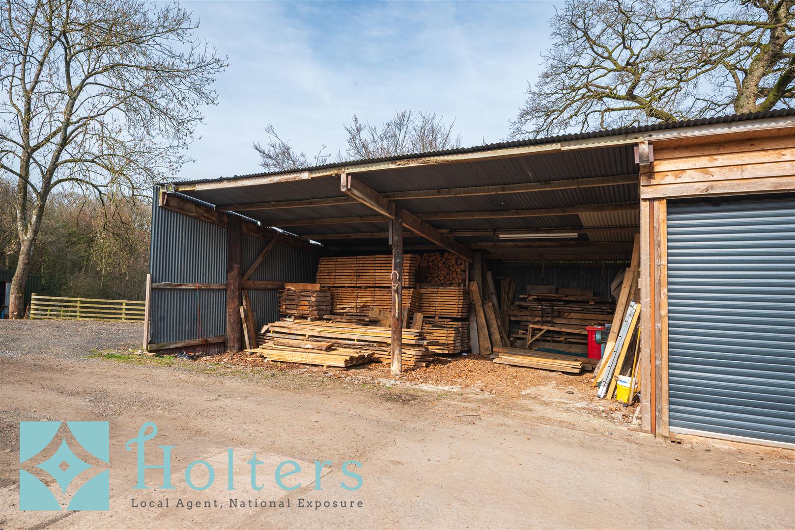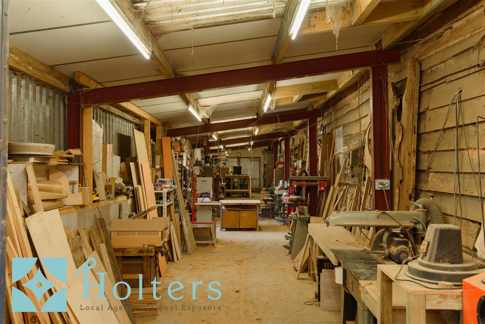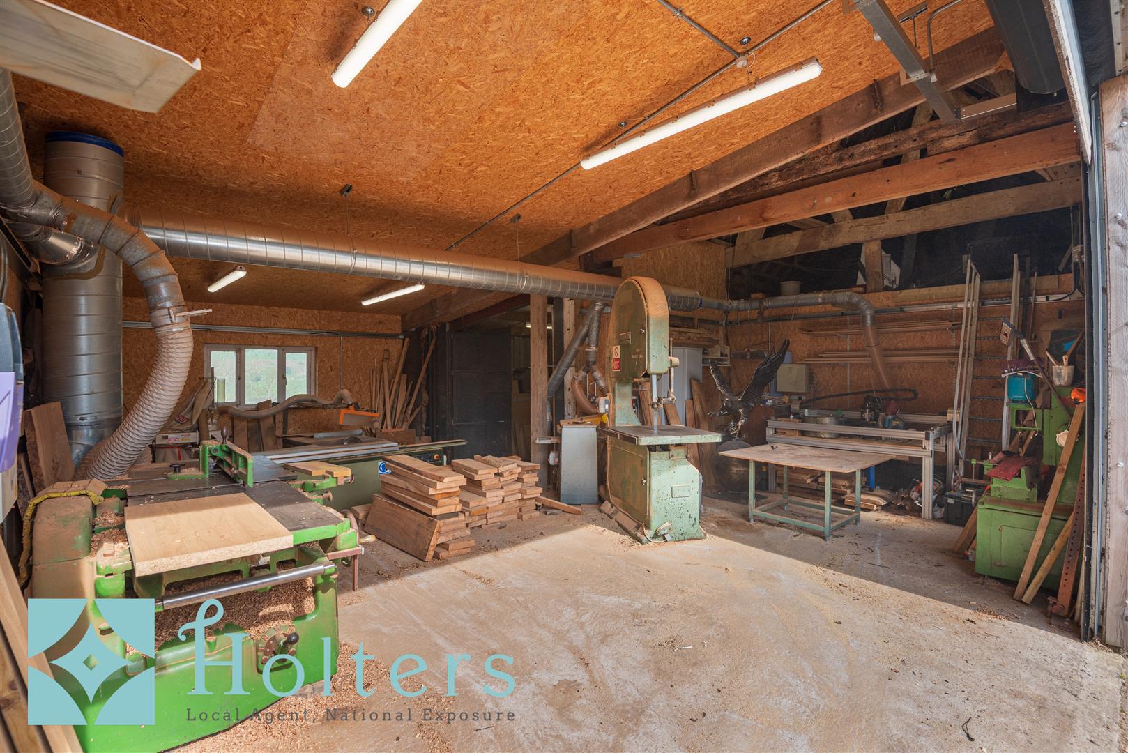 The outbuildings are something else entirely. The principal barn is a handsome timber-clad building with a large solar array on the roof, and inside it houses a workshop that any enthusiast would love. Set up with three-phase electrics and a mechanics pit, with a further connected workshop space alongside, the scope here is considerable. An open-fronted covered area to one side provides additional storage for timber and equipment. A further steel-framed outbuilding sits separately on the plot, and attached to the house itself is an older stone store, thought at one time to have been a pigsty, which adds yet more practical space.