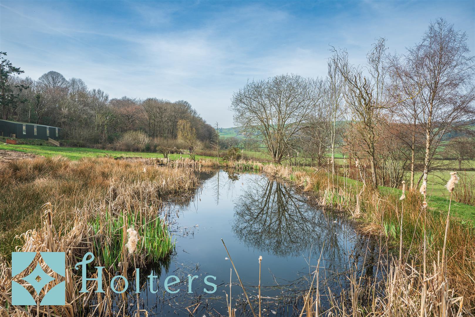The land is a real draw. The paddock extends away from the yard, fenced and gated, and ideal for a pony, chickens, or simply giving children the kind of space to roam that you only find in the countryside. A lovely wildlife pond sits at the far end, fringed with bulrushes and mature trees, its surface reflecting the sky and the hills beyond. There is a further area of woodland and rough ground rising behind the buildings, and the whole plot amounts to around three acres of genuinely lovely Mid Wales countryside.