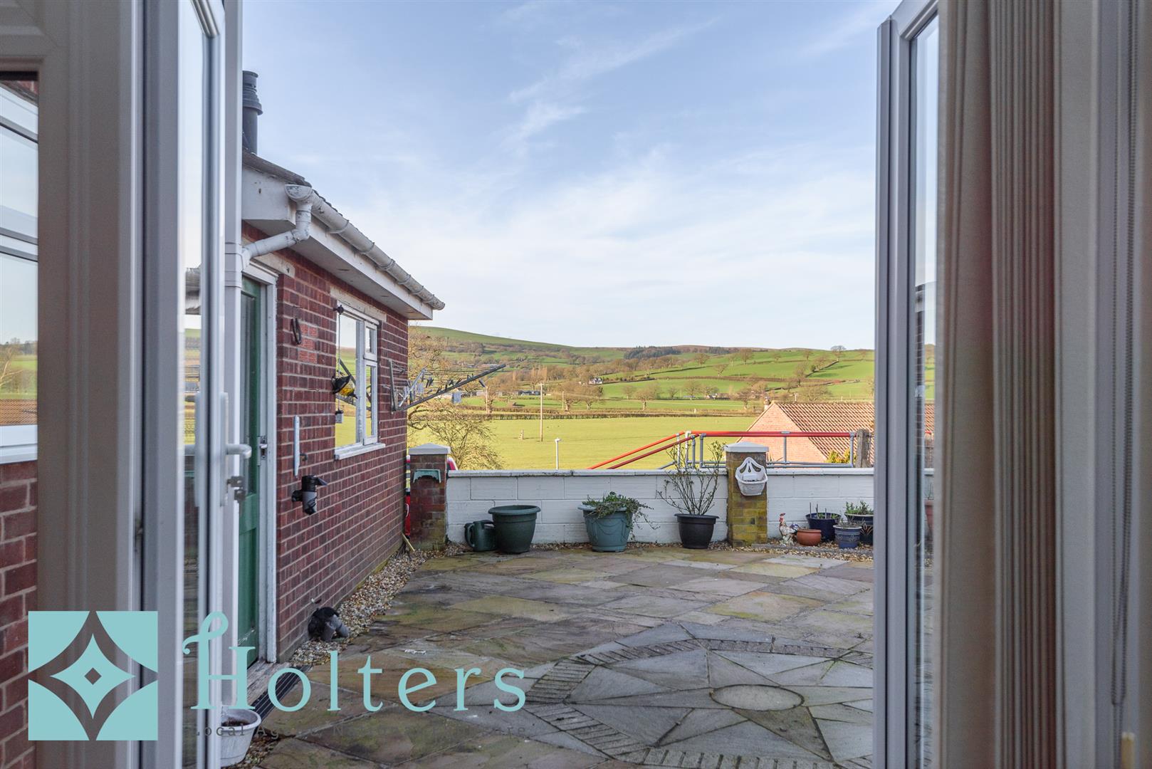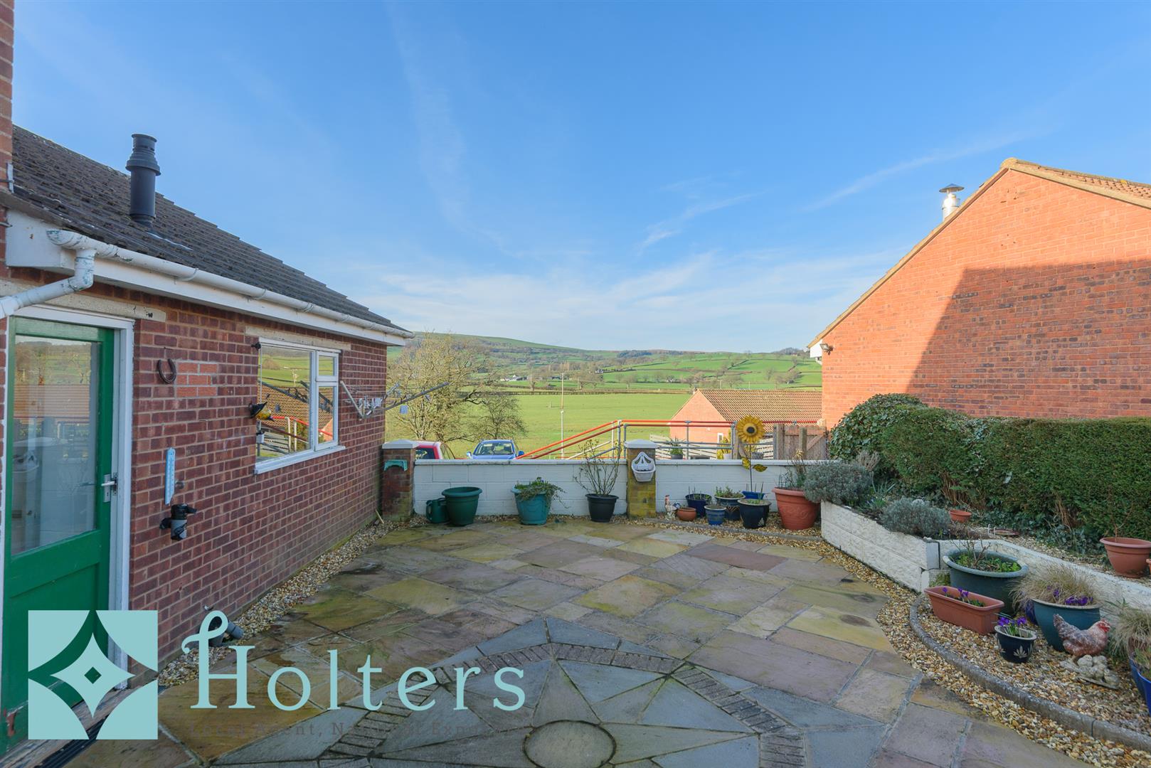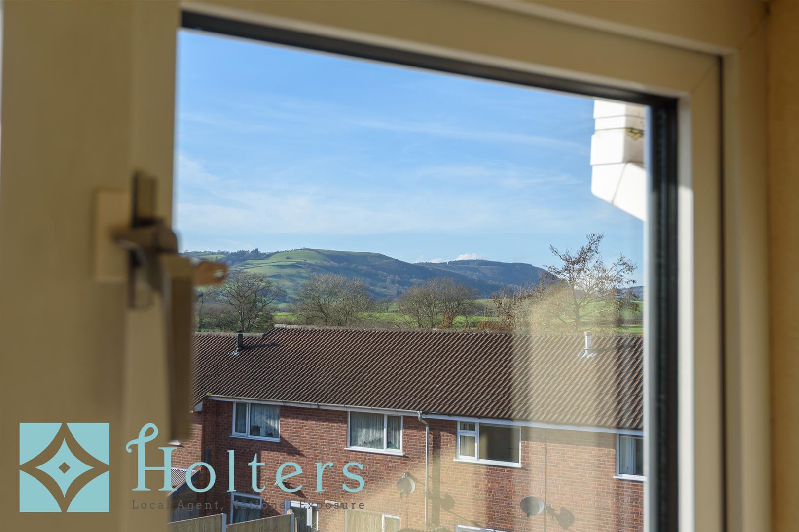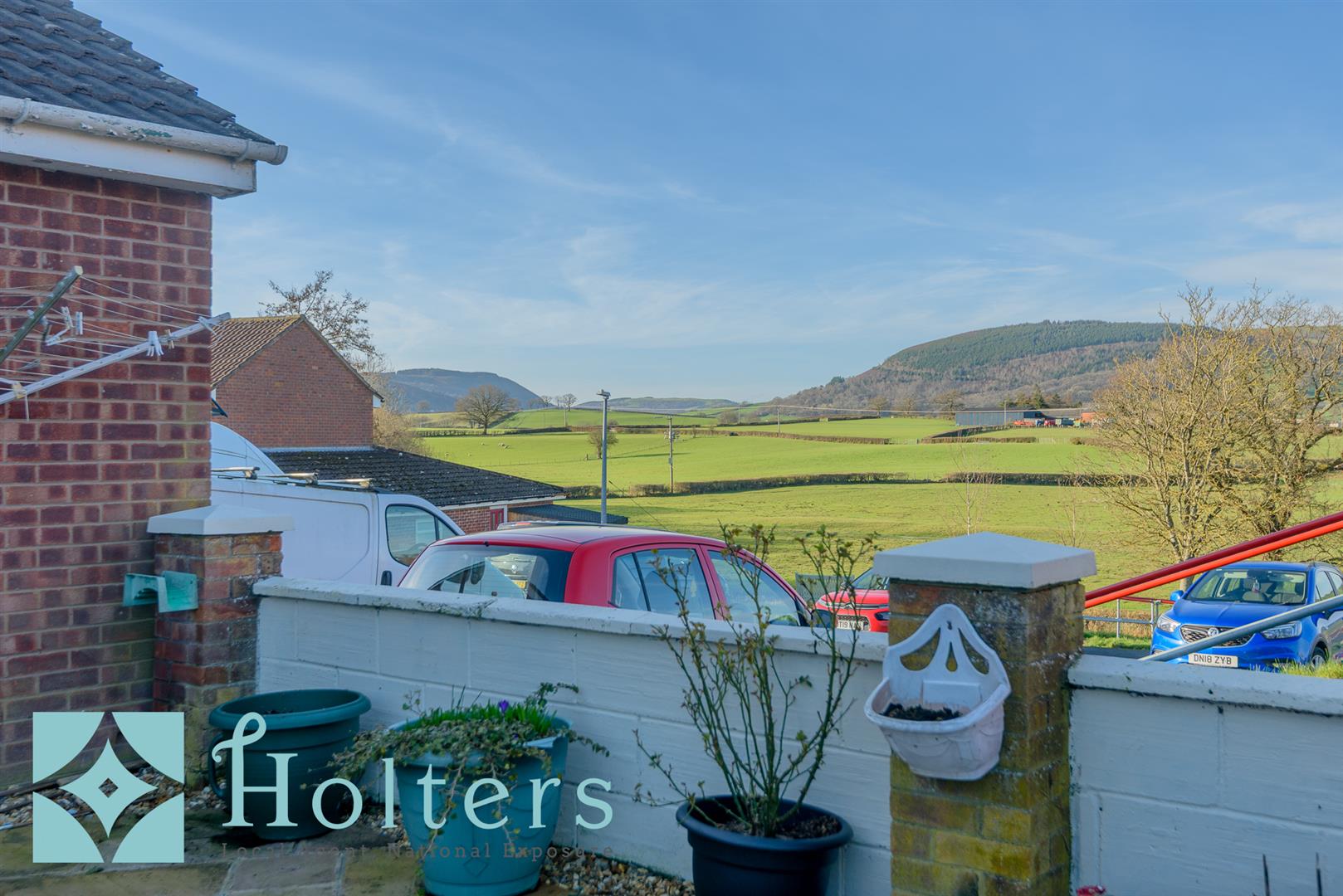 Outside, the rear garden has been thoughtfully designed with ease of maintenance in mind. A generous patio wraps around the back of the property, and the elevated position ensures the views remain a constant feature, with rolling fields and the distinctive mid-Wales hillscape stretching beyond the boundary.