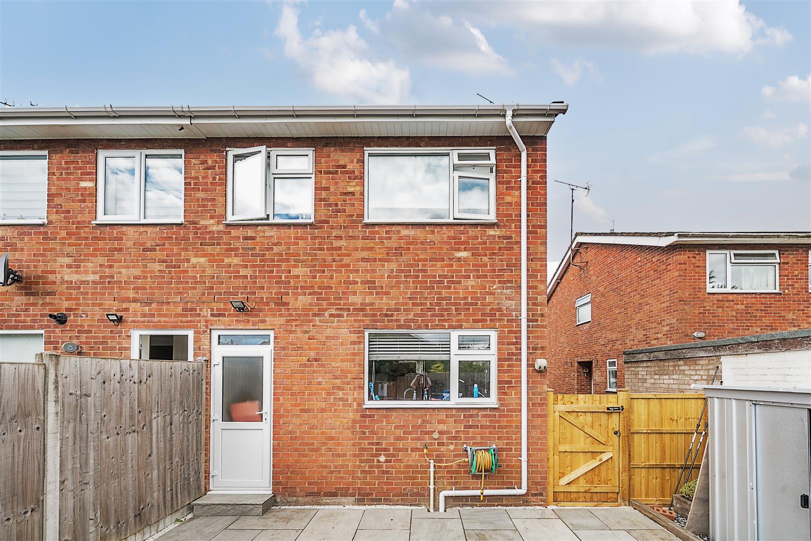 Outside and as mentioned, at the front/side of the property, there is parking available for a number cars, as well as a graveled area. A wooden gate allows access from the driveway into the paved low maintenance rear garden, which has well-defined fenced borders and poses as a pleasant spot to relax within the warmer months of the year.