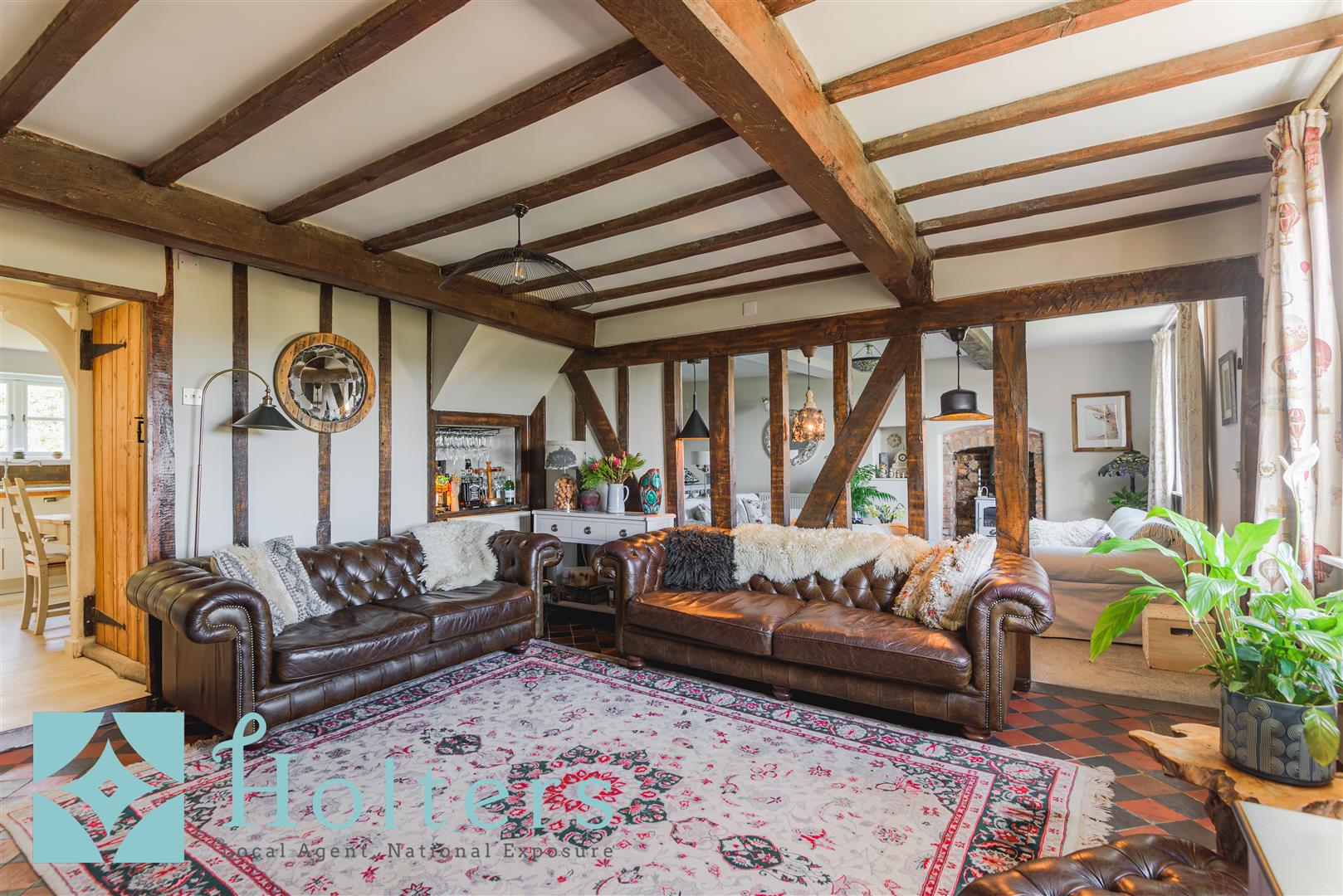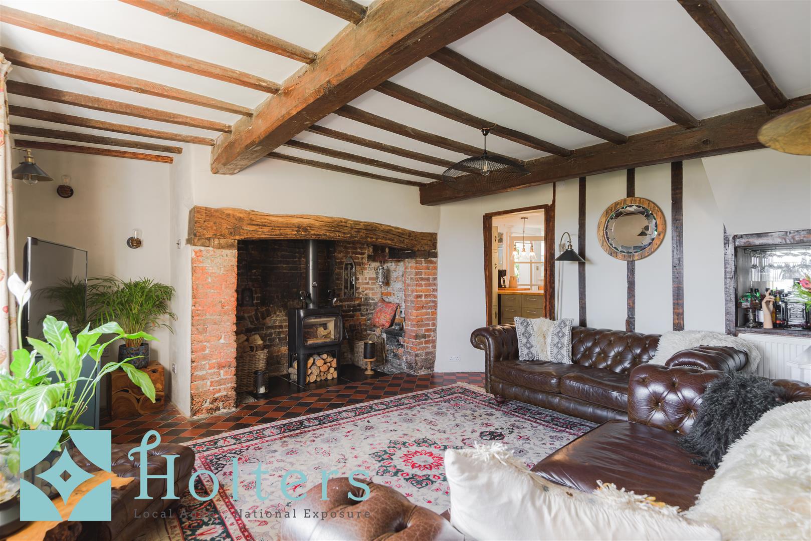 From the kitchen, the house opens into the drawing room, one of the most extraordinary rooms you will find in any home. The original timber frame is exposed on every wall, the original Welsh chequerboard quarry-tiled floor runs underfoot, and the inglenook fireplace commands the room with a presence that is difficult to put into words. The massive brick hearth retains its original bressumer beam and original wooden seats to either side. Some of the slates within the inglenook are believed to have formed part of the original butter-making platform, discovered in the cellar below, and at its centre sits a Jotul log burner. A drinks cabinet is cleverly built into the timber frame on the far wall, glasses hanging above and bottles below, and it is details like this that speak to how the whole house has been approached. The current owners have decorated with real flair and confidence, and the drawing room is a masterclass in how to dress a period interior, with every detail considered and nothing overdone.