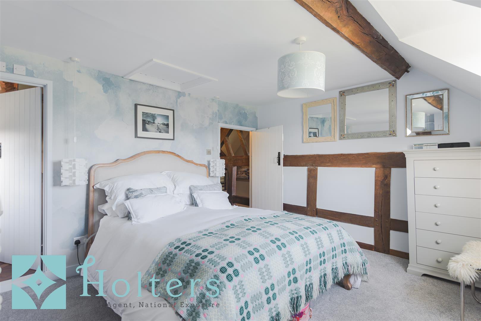 Upstairs, the landing is a moment in itself, the original timber frame and ancient trusses rising overhead as you move between rooms. The master bedroom is a generous and beautifully decorated space with an abstract watercolour wall and exposed beams, with a door through to a superb en-suite shower room featuring a large walk-in shower, a stone bowl basin set on a bespoke vanity unit and WC with parquet flooring. The second bedroom is a wonderfully characterful double, decorated in bold yellow with feature wallpaper and exposed roof timbers, full of personality. Bedrooms three and four sit to the rear of the house, both well-proportioned doubles, with bedroom four benefiting from its own en-suite WC and basin. The family bathroom is a beautifully finished room with a freestanding roll-top bath, basin and WC. Storage has been thoughtfully considered throughout the first floor, with generous provision across all rooms.