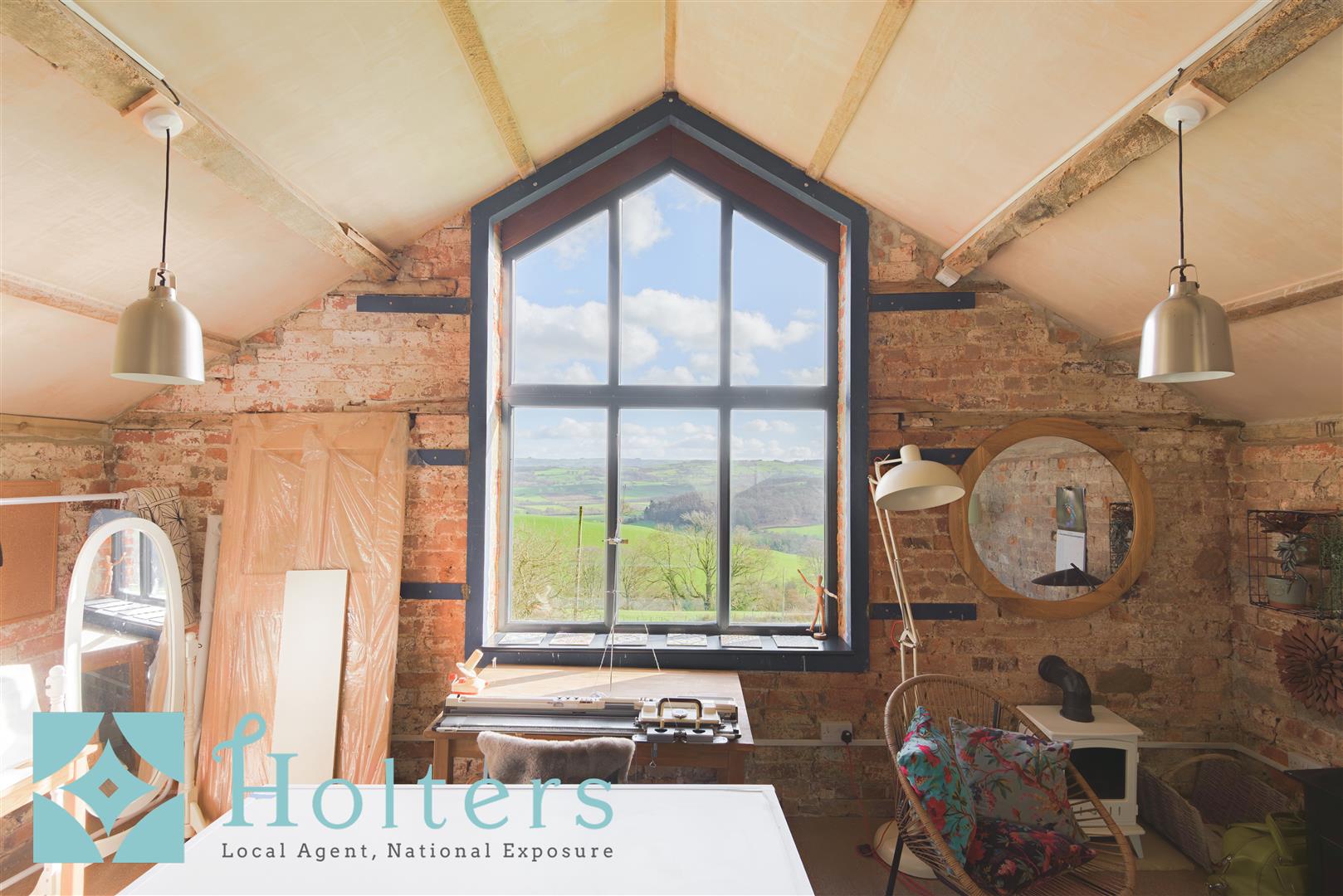 The red brick barn is a substantial and remarkable building. Part of the upper floor has been converted into a stunning studio space, vaulted with original oak trusses, exposed brickwork and a full-height apex window framing an extraordinary view across the countryside. Power and lighting are installed throughout and the space is currently in use as a design studio. The remainder of the upper floor and the ground floor provide extensive workshop and storage space. Full planning permission was granted in 2019 for residential conversion, with a restriction in place preventing resale as a separate dwelling, offering the next owners the exciting prospect of creating an annexe, holiday accommodation or creative retreat of real quality.