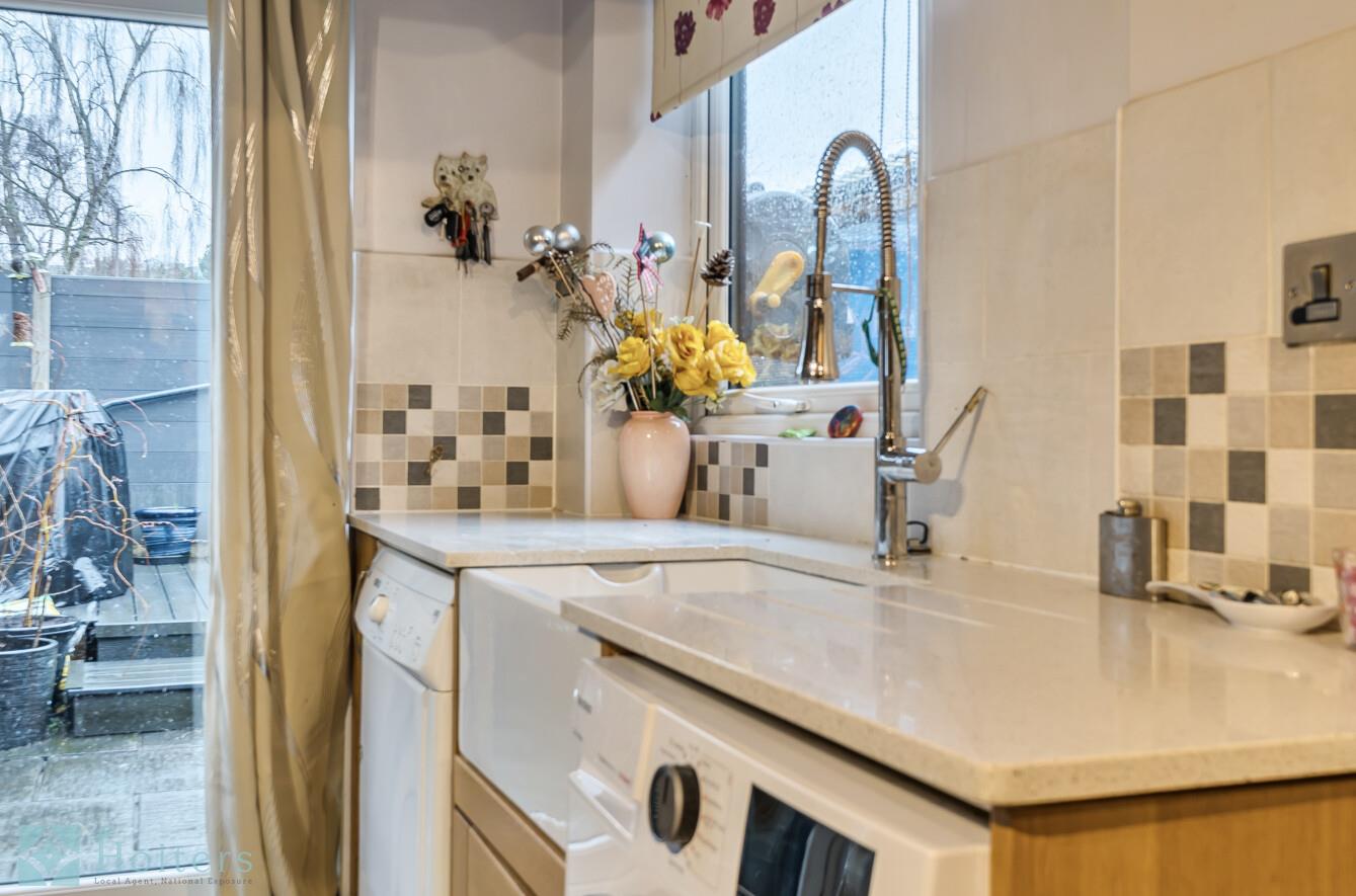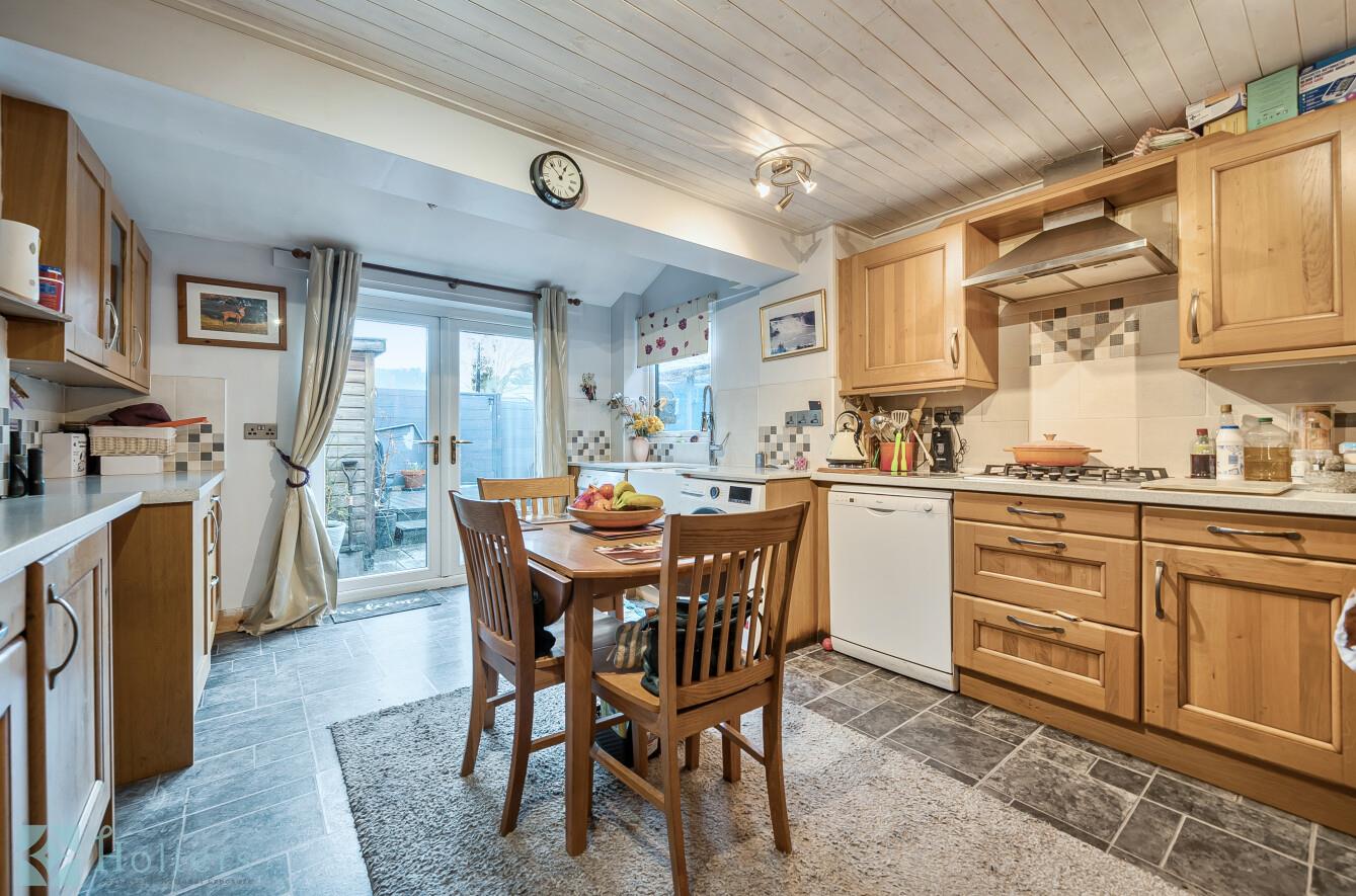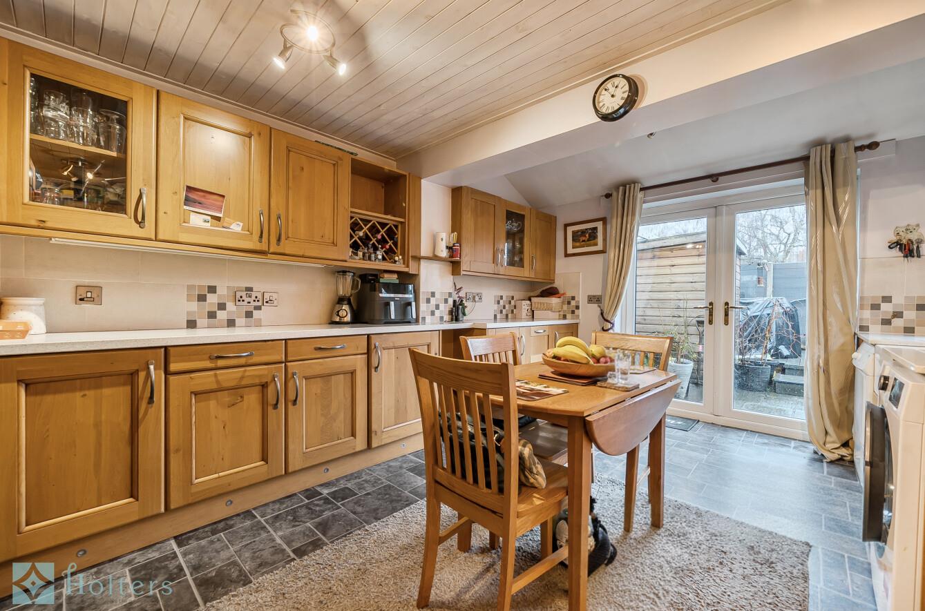 Step inside to a welcoming entrance hall with stairs rising to the first floor. The reception room sits to the front of the property, a comfortable family space with pleasant natural light. Moving through, the kitchen/dining room runs across the rear - a real hub of the home with timber units, tiled splashbacks, integrated appliances, and room for a dining table. French doors open straight out to the rear courtyard garden, making this a lovely space for everyday living and easy indoor-outdoor flow.