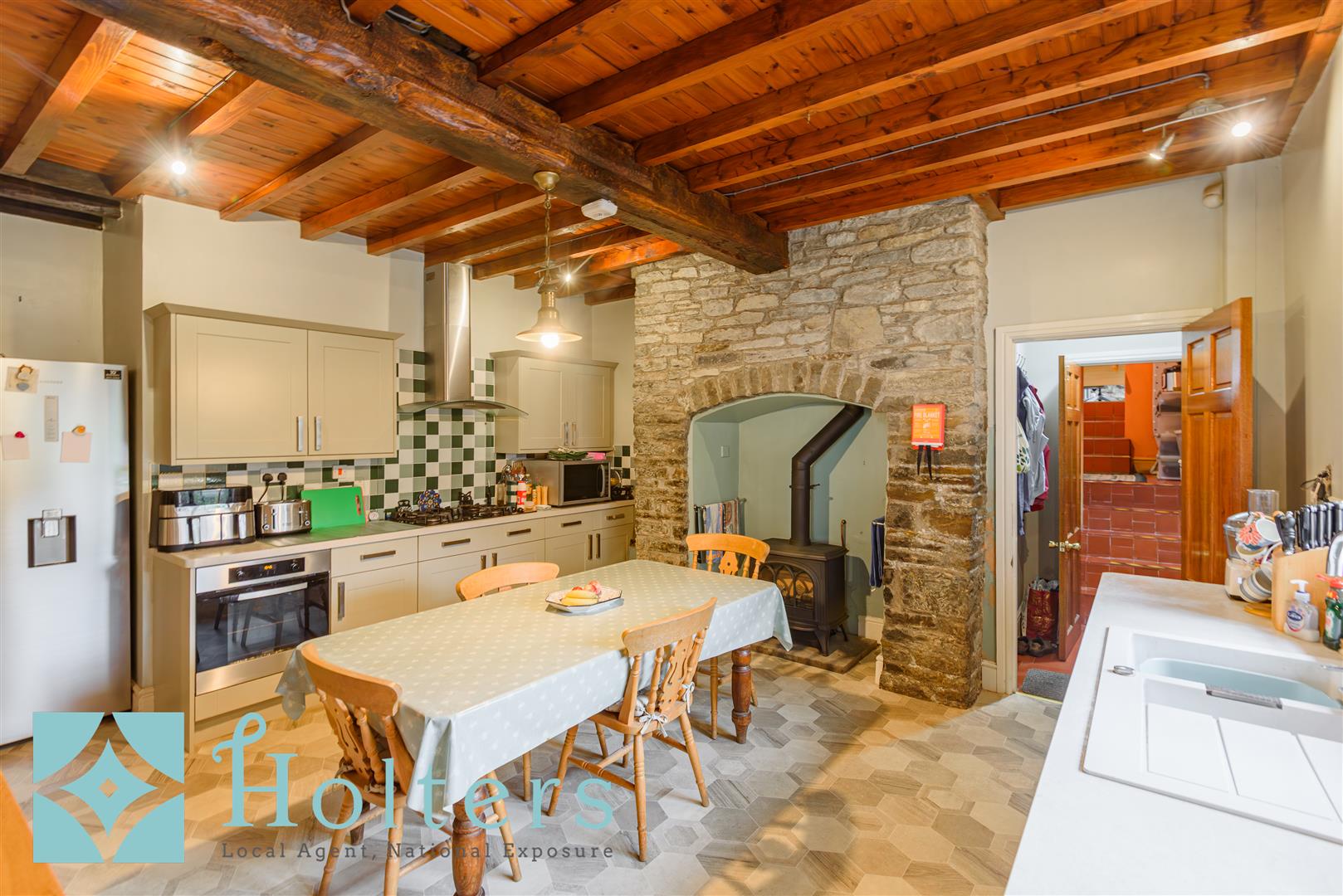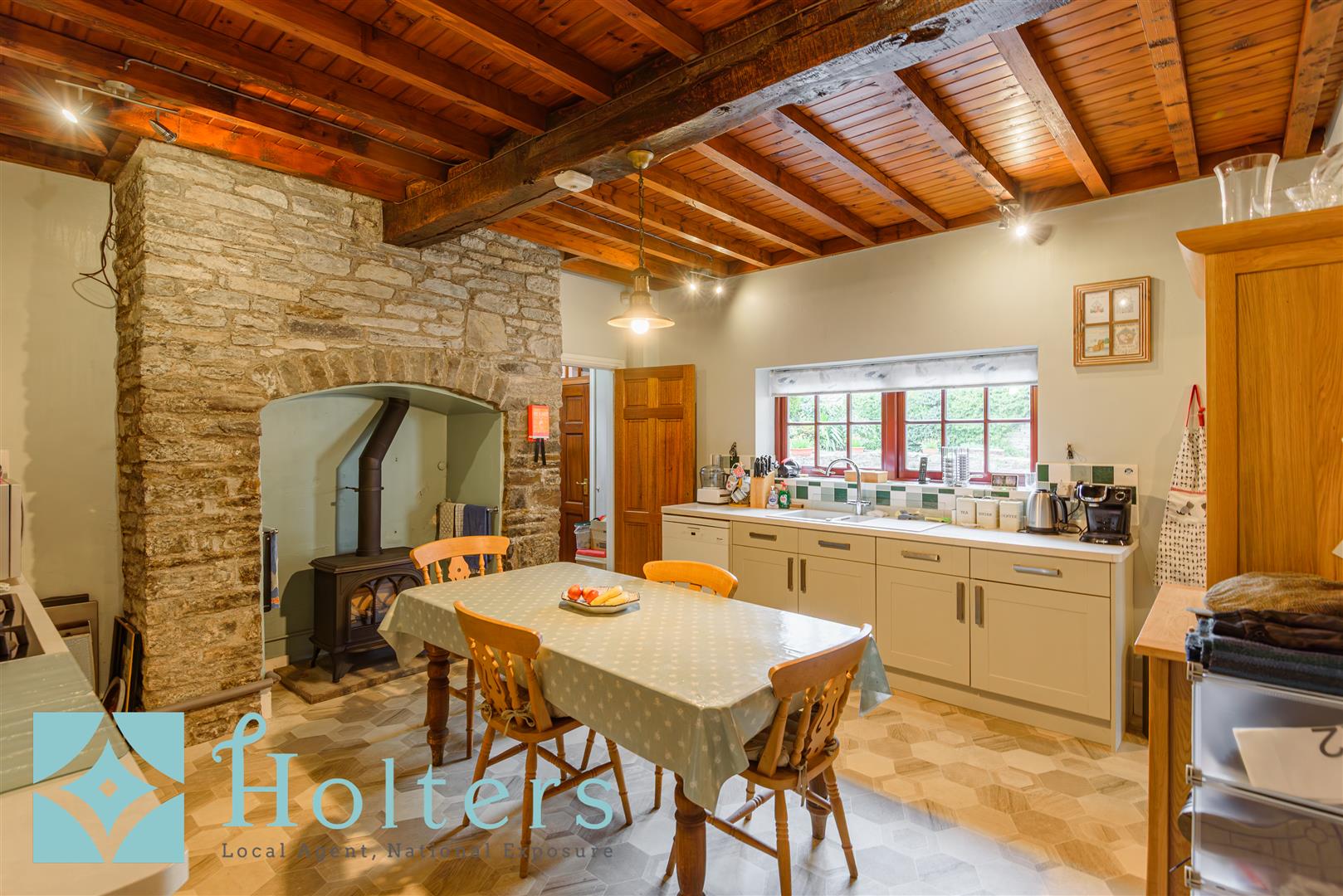 The rear entrance, accessed from the parking area, serves as the everyday point of entry, whilst the front door is approached from the roadside via a pathway. The entrance hall has stairs rising off to the first floor and gives access to the downstairs W.C, sitting room and living dining room. The sitting room has double doors to the rear patio and a feature fireplace with inset gas-fired wood-burning style stove. The living dining room enjoys a dual aspect, a second matching fireplace and space for both a dining and sitting suite. Beyond lies the fully-equipped kitchen diner, fitted with base and wall units, an inset sink, electric oven, gas hob, extractor hood and space for a dishwasher and American-style fridge-freezer. The centrepiece is an exposed stone inglenook with a further fitted gas-fired wood-burning style stove. A door leads to a larder, store and office with stone steps down to the sizeable cellar area. The rear hall connects to the outside and to the useful utility room, which houses the Worcester boiler and has plumbing for white goods. To the rear of the utility, a further door leads to the study/sun room, which is a comfortable space for working from home or relaxing.