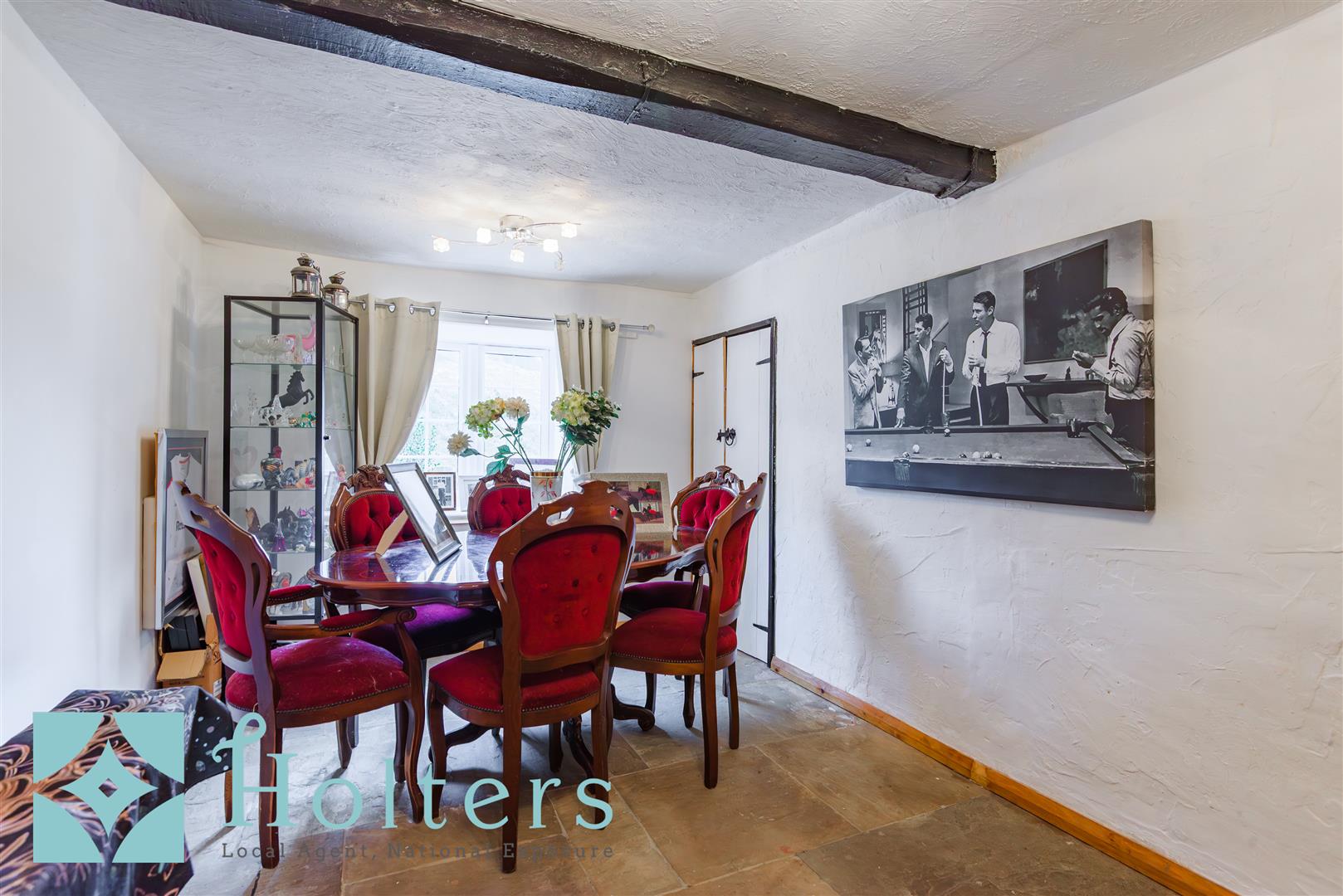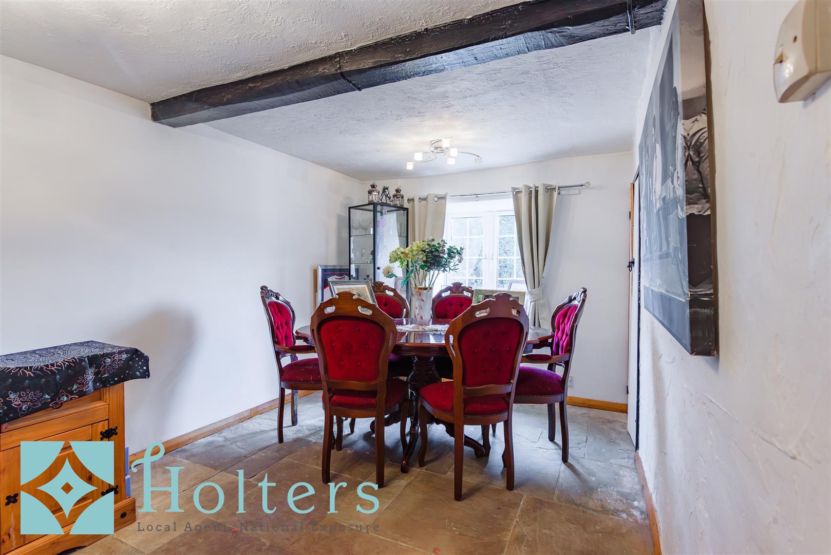 Beyond, the sitting room forms the heart of the cottage, with exposed stone walls, original beams and a wood-burning stove set within a substantial inglenook fireplace. A traditional tiled floor further enhances the sense of age and character. The adjoining dining room, with its flagstone flooring and beam ceiling, continues this theme, and there is a consistent sense throughout the ground floor of a house that has evolved naturally over time.