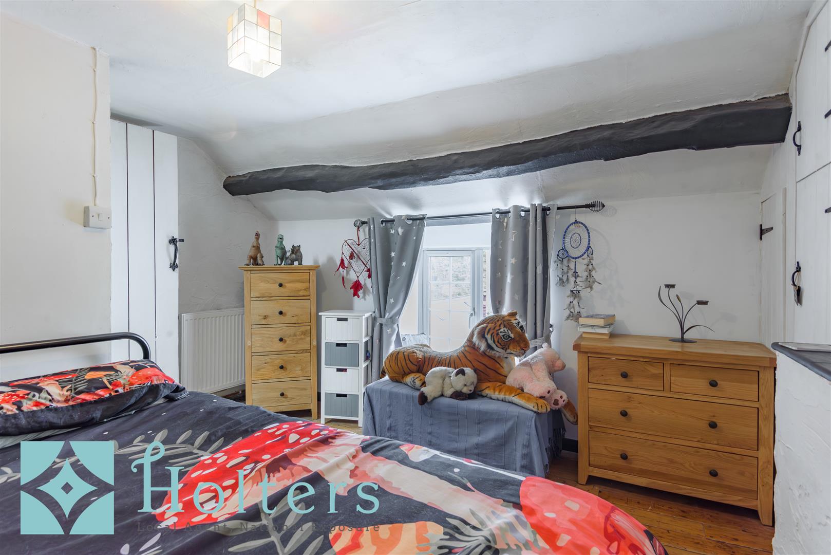 Upstairs are two double bedrooms, each with the characteristic sloping ceilings and exposed beams typical of a cottage of this age. Both enjoy open views across the hills and valleys of mid-Wales, making the setting a constant presence.