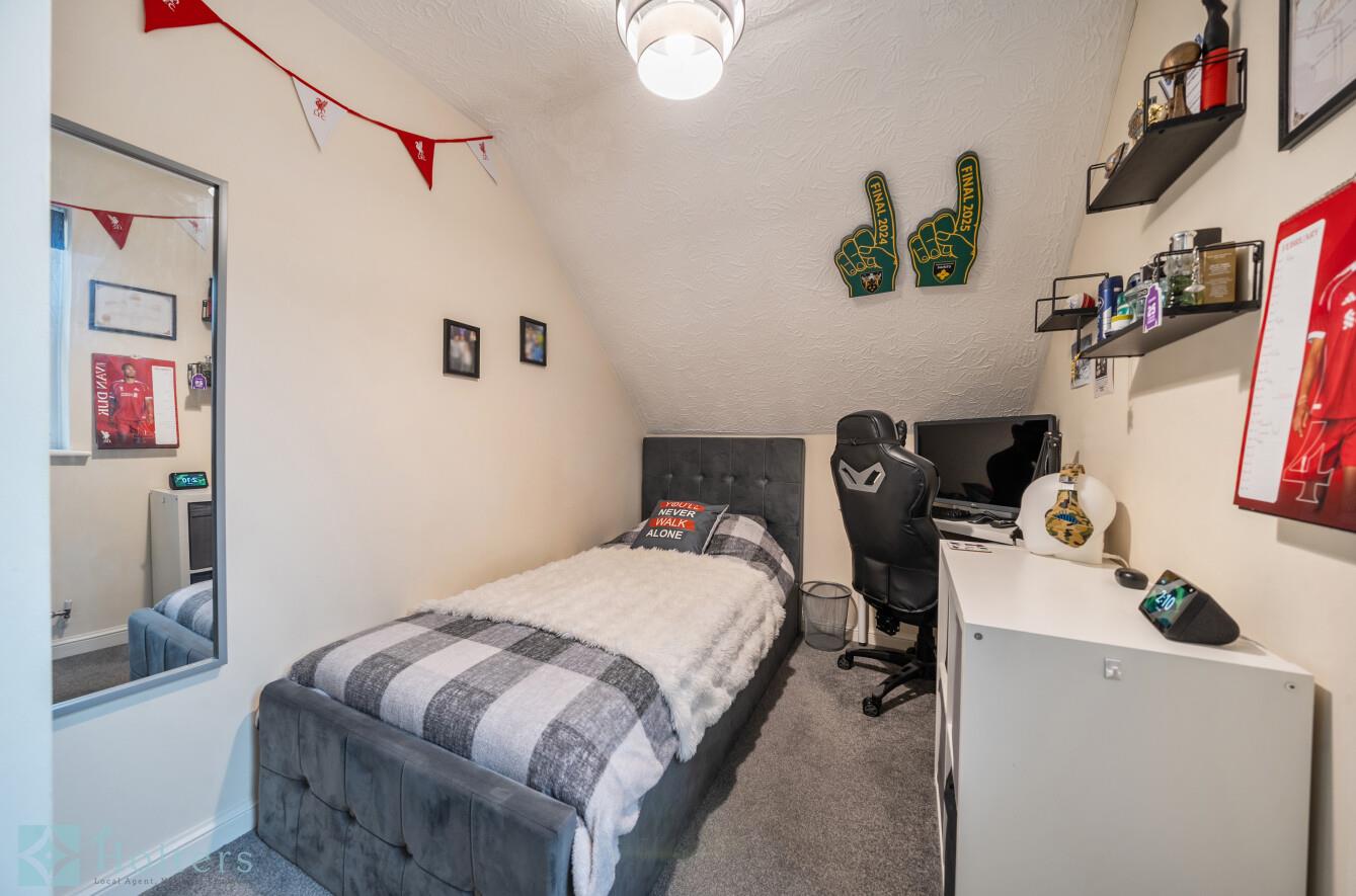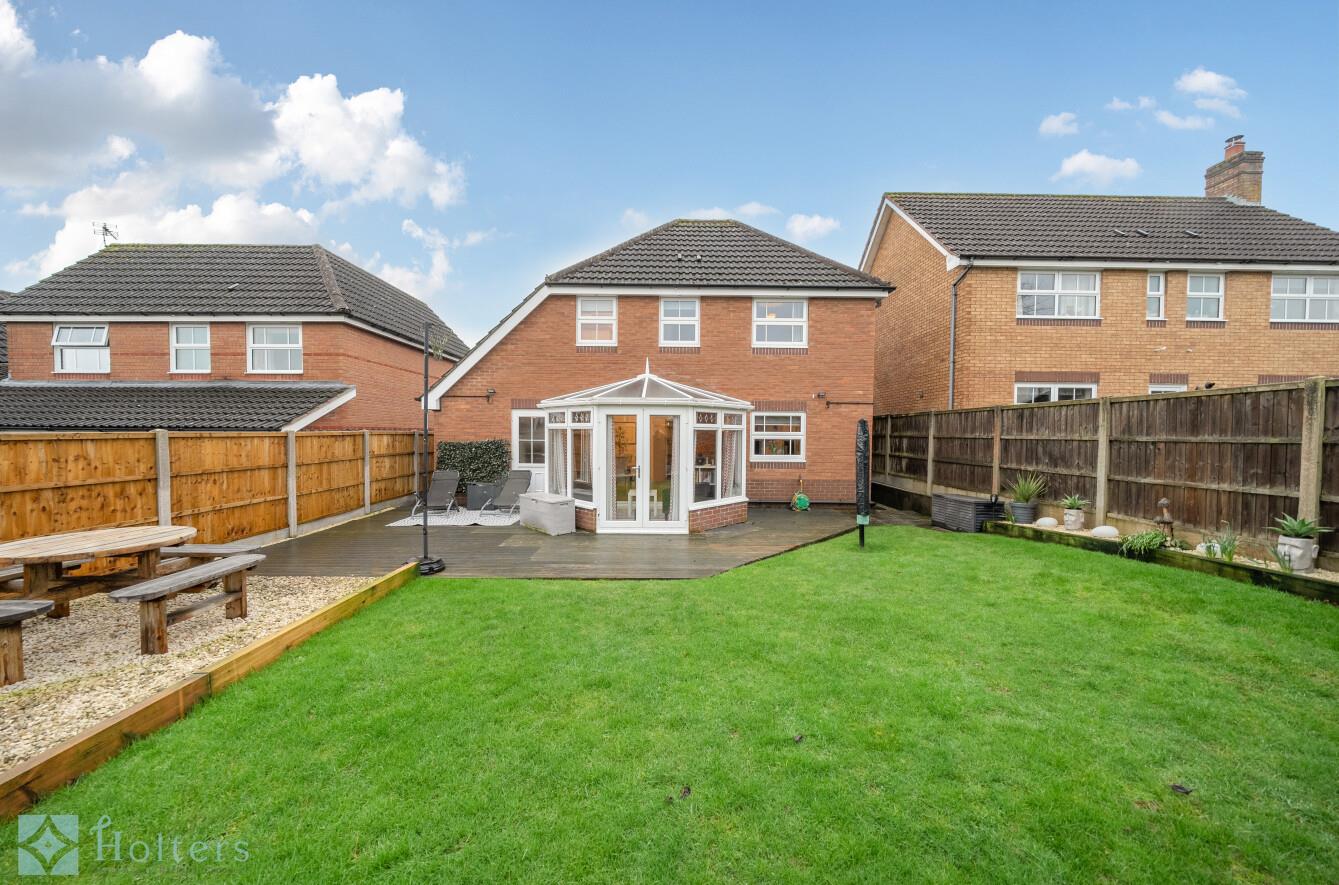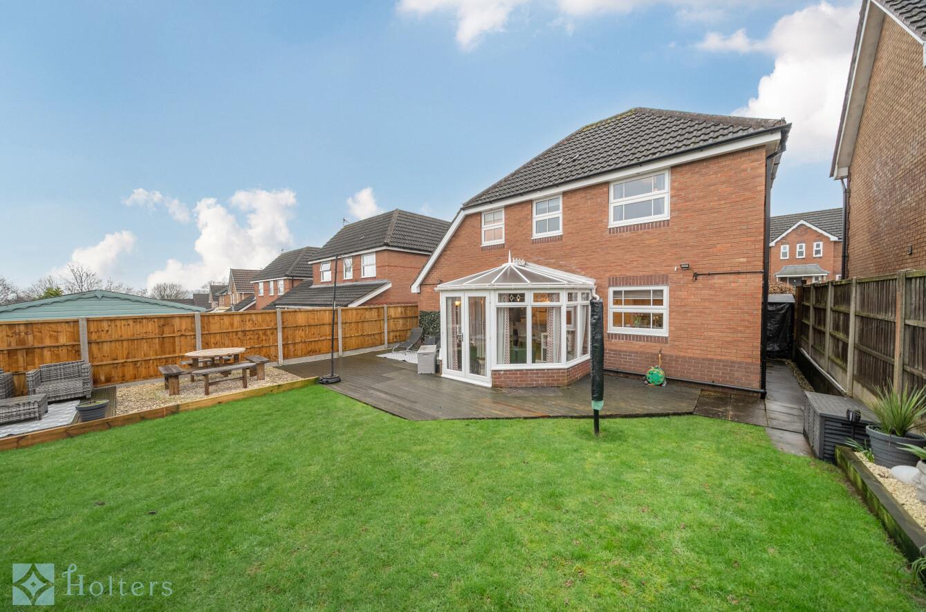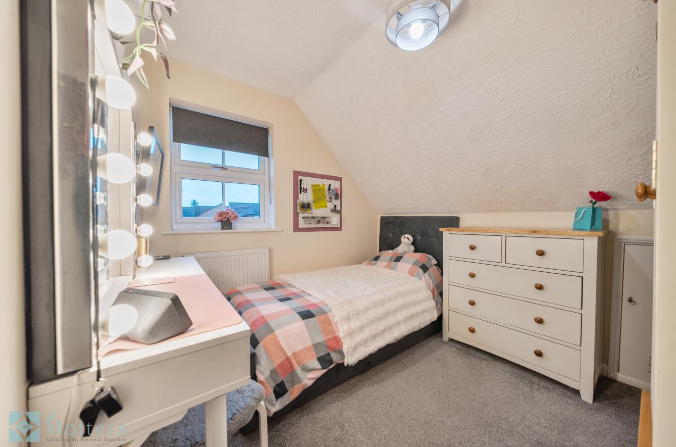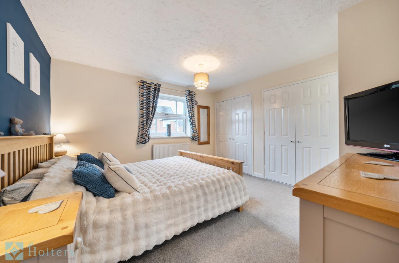 Heading upstairs, the first-floor landing leads to four bedrooms, all of which are well proportioned and serviced by a family bathroom fitted with a modern white suite. The main bedroom is a particularly generous double and benefits from its own en-suite shower room, while the remaining bedrooms offer flexibility for family members and guests.